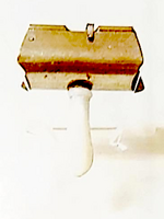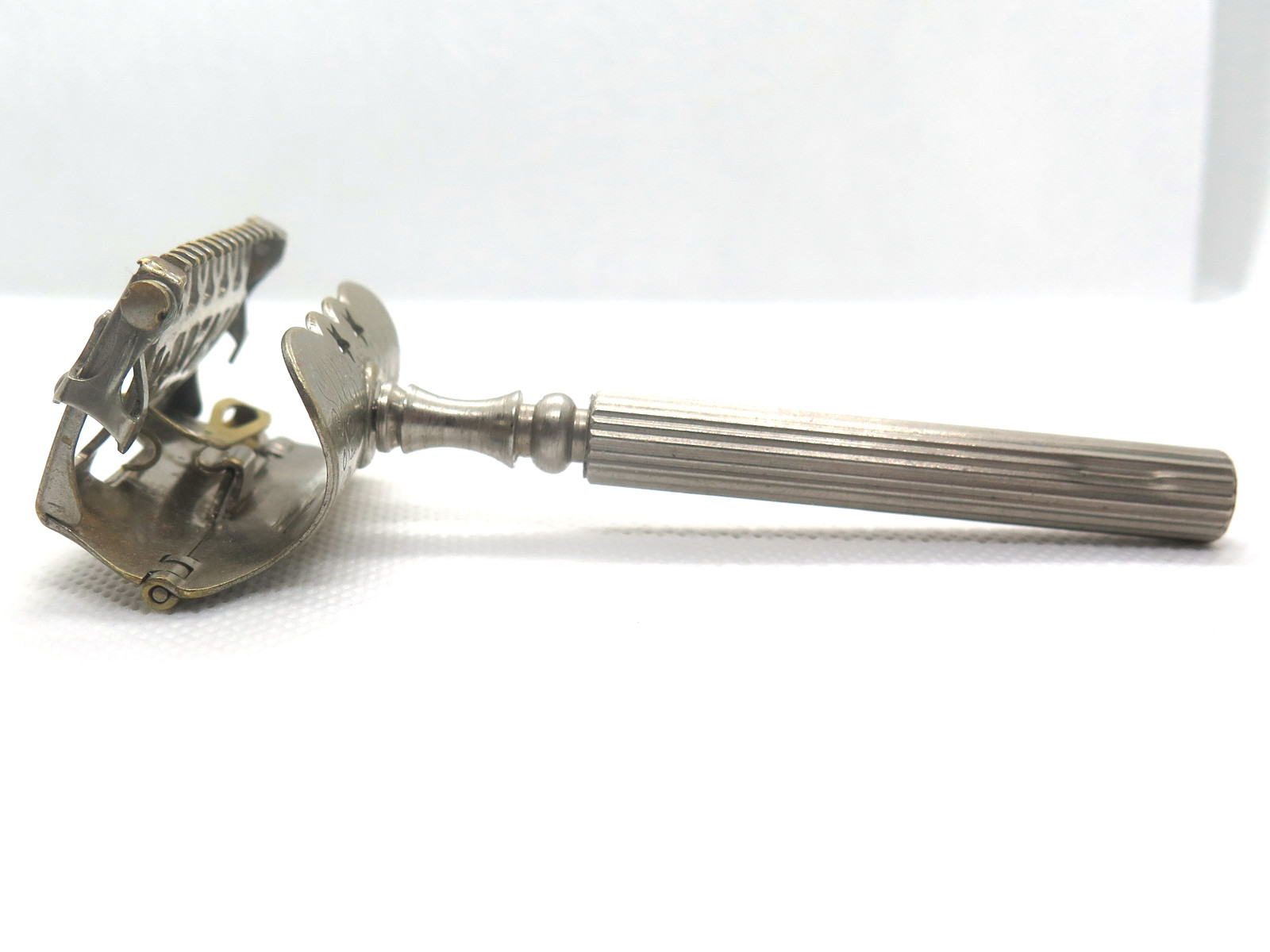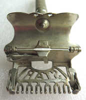 Hazelcorn: HR-S2 Patents: Last February 18, 1896 Awards: None Head: Open at front, hinged at back, made from Sterling Silver Adjustment: Spring clip - patent not applied for until 1901 Top: Fixed, STAR Teeth: 6×2 Y-shaped Blade stops: Front: Blank Stars: ☆☆ Back: Blank Rivets: 1 Inside: Patent date, "Sterling" Handle: One piece, Celluloid, Ivory or Mother of pearl Rarity: 6 — unicorn