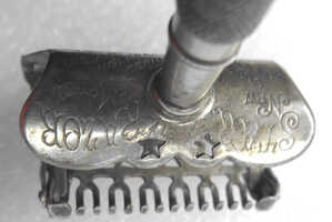 Hazelcorn: N/A Patents: USA: AUG.7.1888 — FEB.26.1901 — APRIL 30.1901 Eng. Germany France Italy: Pending Awards: Highest Award Paris 1900 Head: Open at front, hinged at back Adjustment: Spring clips Top: Fixed, STAR Teeth: 6×2 Y-shaped Blade stops: Front: STAR SAFETY RAZOR NEW MODEL Stars: ☆☆ Back: KAMPFE BROS. NEW YORK USA Rivets: 1 Handle: Two piece, star Rarity: 7 — unkown to Hazelcorn